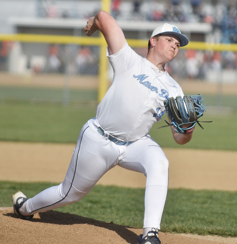 Mater Dei's Andrew Sinnock had five strikeouts in three innings pitched in the Knights' 11-9 loss to Wesclin. Photo by Matt Wilson