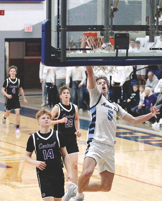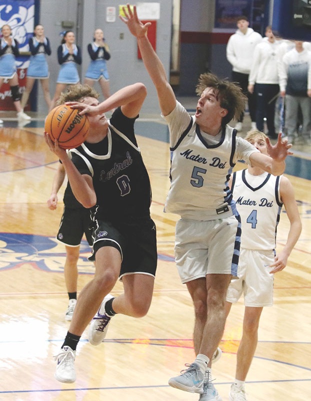 Lay it in — Mater Dei senior Gavin Peppenhorst sends in a transition bucket in the Knights’ 50-40 loss to rival Central on Wednesday in Nashville. Peppenhorst had 16 of his 25 points in the second half. PHOTO BY JEREMY CHAWGO Meanwhile, Ritzel came out inspired with three drives, a three-pointer and a free throw while Palmer Renken hit two three-pointers as the rout was on at 16-5 after one quarter.