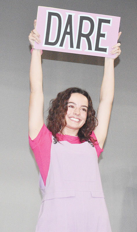 McKenna Salyers holds up a sign during a practice for "Dare to Dream Jr." The trainees help each other discover and pursue their dreams, highlighting the power of imagination, collaboration and inspiration to make anything possible.