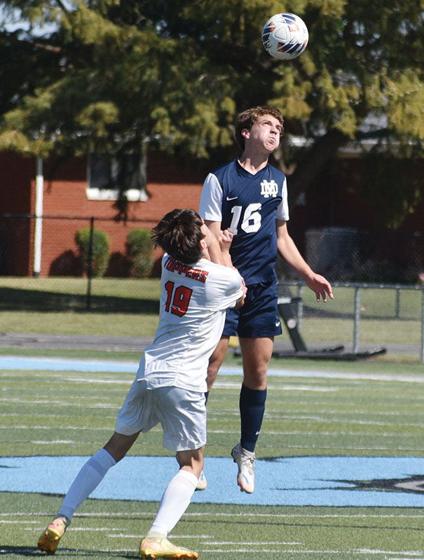 Header - Mater Dei junior boys soccer player Liam Driscoll heads the ball against Hillsboro. PHOTO BY MATT WILSON The Mater Dei boys soccer team finished a busy three-match week with a 0-1-2 record to move to 6-5-3 on the season.