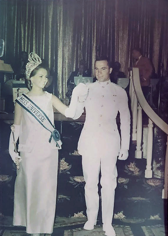 “While Denny was stationed in Pensacola, FL for pilot training in 1967 his Marine troop was assigned to be the escorts for the 1967 Miss Universe pageant contestants. He was originally assigned to Miss Spain but since he could speak no Spanish and she no English he was re-assigned to be escort for Miss USA. As it turns out Miss USA won the Miss Universe contest that night.”