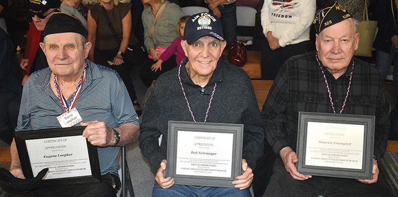 Local veterans, FROM LEFT, Eugene Loepker, Bob Netemeyer and Maurice Eversgerd received a certificate of appreciation following a virtual Honor Flight on Wednesday, Nov. 5, at Standin' Proud Museum in Bartelso. Photo by Matt Wilson Three local veterans were given a virtual Honor Flight on Wednesday, Nov. 5, at Standin’ Proud Museum in Bartelso.