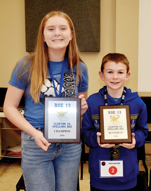 Damiansville eighth-grader Charlotte Cleeton was the champion and Damiansville fifth-grader Will Jansen was the runner-up during the Clinton County Spelling Bee on Feb. 5 at All Saints Academy. Photos by Matt Wilson In the 32nd round, Cleeton correctly spelled the word sortie — a deployment or dispatch of one military unit — to be crowned the champion.
