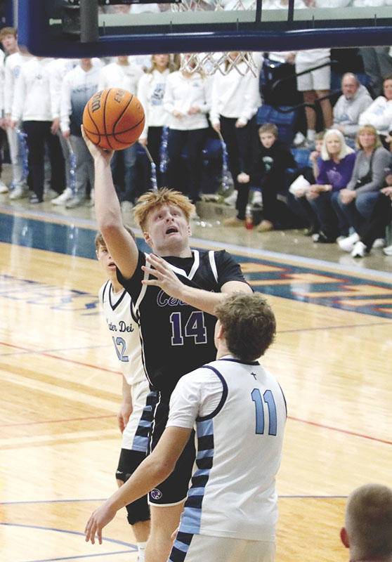 Lay it in — Mater Dei senior Gavin Peppenhorst sends in a transition bucket in the Knights’ 50-40 loss to rival Central on Wednesday in Nashville. Peppenhorst had 16 of his 25 points in the second half. PHOTO BY JEREMY CHAWGO Meanwhile, Ritzel came out inspired with three drives, a three-pointer and a free throw while Palmer Renken hit two three-pointers as the rout was on at 16-5 after one quarter.